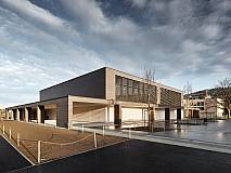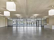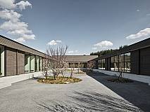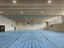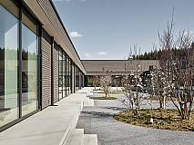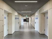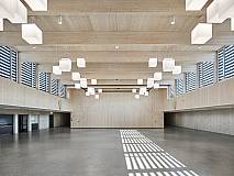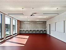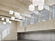 The concept of arranging all rooms on a single level grew out of clear specifications regarding organizational, educational, economic and increased security requirements. The school building is 164 feet wide and 460 feet long and totals some 75,000 square feet. A short construction period and sustainability requirements inspired a hybrid construction method with prefabricated mass timber and concrete elements.